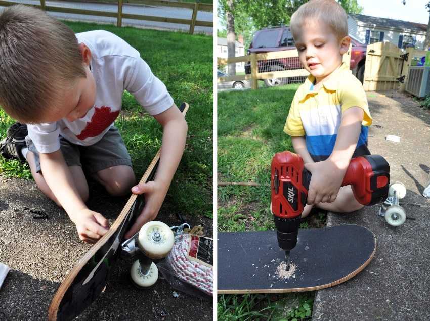 Детские качели из скейтборда, шаг 2: демонтаж роликов с доски и сверление в ней отверстий.