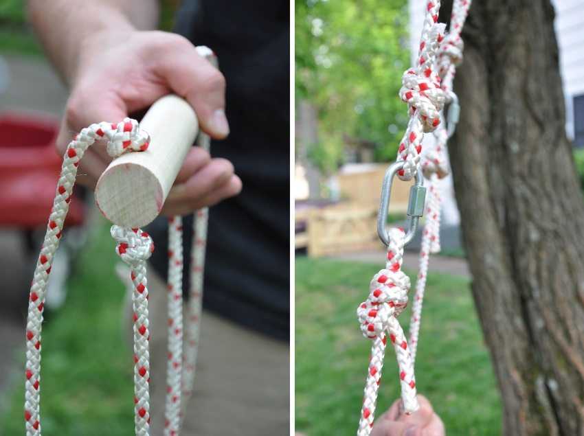 Детские качели из скейтборда, шаг 5: закрепление созданной конструкции на дереве с помощью карабинов.