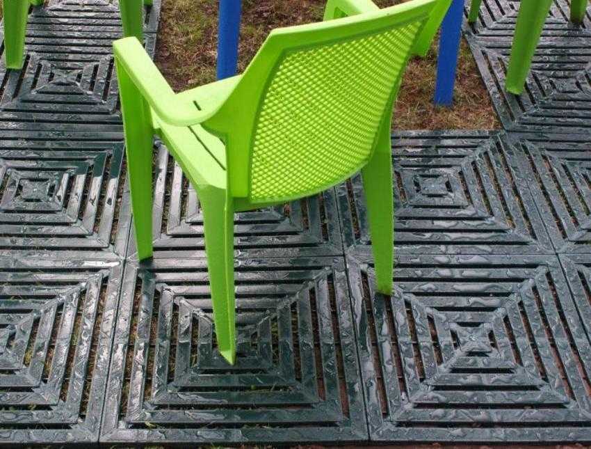 С виду такая дорожка смотрится не очень привлекательно, но все можно исправить, если резиновые плиты покрасить, а в зазоры между ними насыпать цветную гальку.