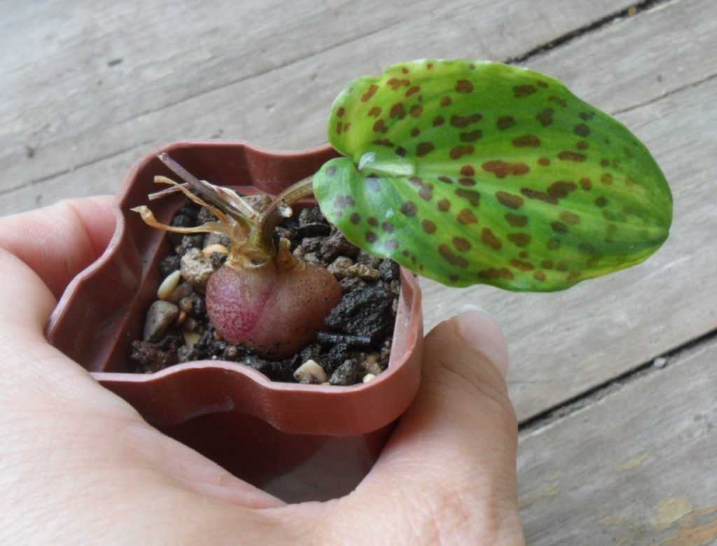 - Пятнистую (черешковую): имеет сердцевидные зелёные в крапинку листья, которые может сбрасывать, они достигают размеров 12 на 7 см, произрастая на 15-сантиметровых черешках; мелкие беловатые цветы появляются с середины весны до середины лета; зимой растение уходит в «спячку», иногда полностью избавляясь от листвы;