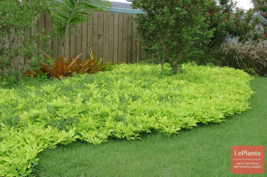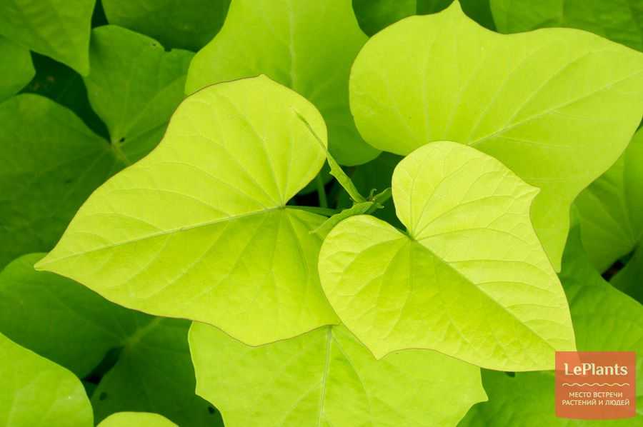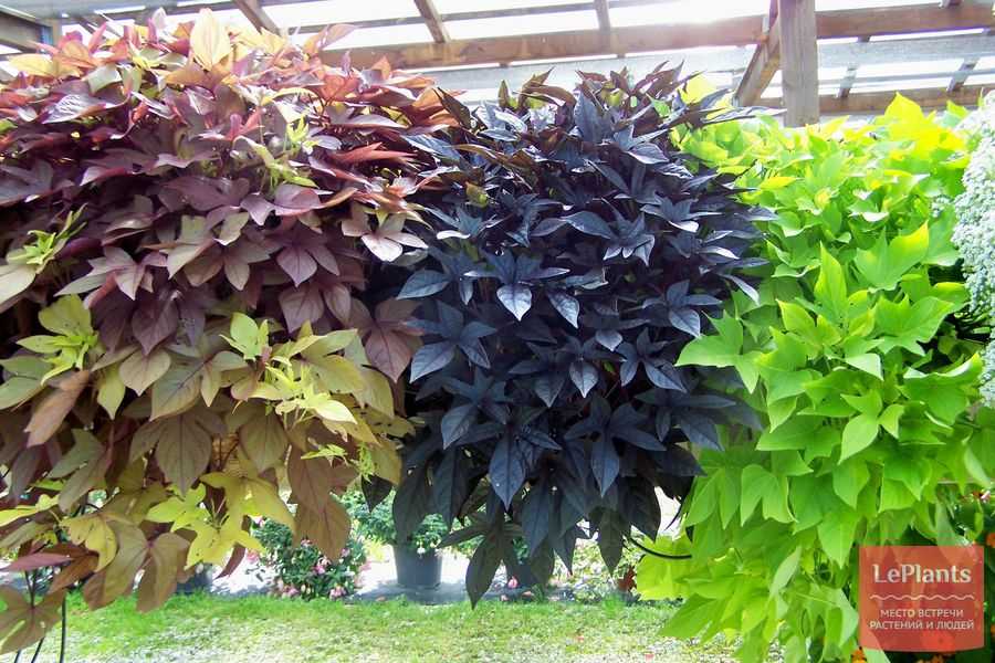 Сорт Батат отличается от остальных сортов. Это растение со сладкими клубнями. Лианы вырастают до 2 метров. Листья бывают нескольких форм: сердцевидные, рассеченные, пяти лопастные. Батат используют в декоре не только из-за формы листьев, так и из-за их цвета.
