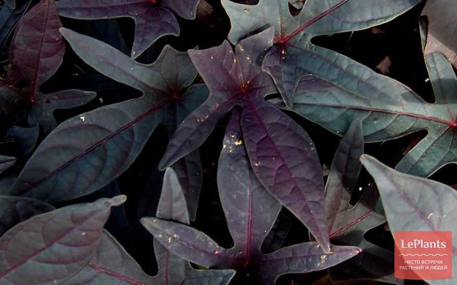 Ипомея батат – лиана длиной 1-2 м с крупными листьями различной формы: пятилопастные, сердцевидные, сильно и не очень сильно рассечённые. Листья декоративны не только благодаря форме, но и из-за цвета, они могут быть жёлто-зелёные, бордовые, фиолетово-коричневые. Существуют и пестролистные сорта ипомеи батат.