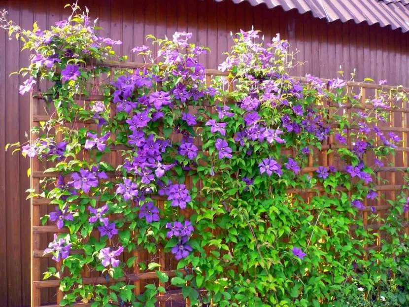 Крупноцветковые клематисы тоже отлично соответствуют этой цели, особенно быстрорастущие и обильно цветущие сорта из садовой группы Витицелла или гибридные формы третьей группы обрезки.