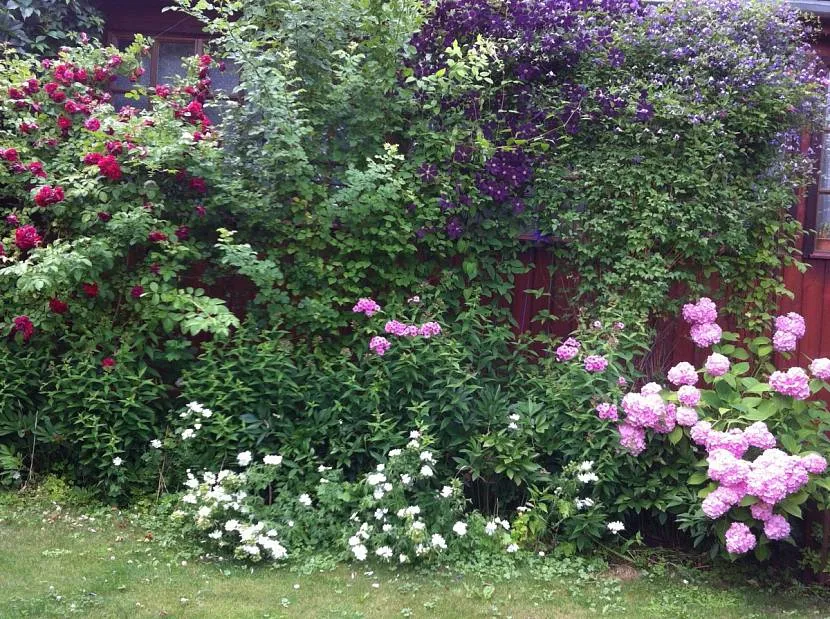Кусты сирени и шиповника, после того, как закончится пора их цветения, часто оживляют при помощи низкорослых кустиков клематисов.
