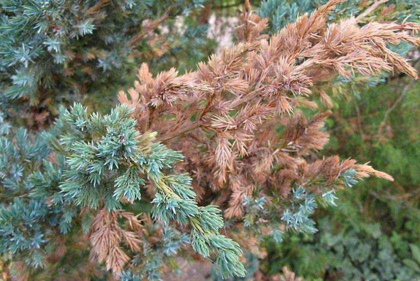 Если было замечено, что верхушка растения стала сухой, то это свидетельствует о поражении можжевельника таким заболеванием, как фузариоз. Грибок Fusarium может распространиться по всему растению. Сначала иголки на ветках приобретают красный оттенок, а корни полностью чернеют. Немного позже болезнь распространяется дальше и перекрывает подачу необходимых полезных веществ. Бороться с таким заболеванием нужно только специальными химическими препаратами. Для этого подойдут «Фитоспорин» или «Топаз». Кроме этого, можно попробовать заменить землю под можжевельником. Но чаще всего в этом случае растение полностью погибает.