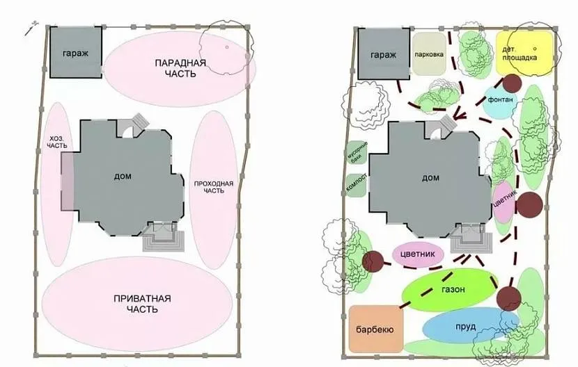 Территория должна быть не только красивой, но и удобной. Разделение пространства на функциональные части позволяет грамотно использовать полезные квадраты. Дизайнеры выделяют 6 зон: