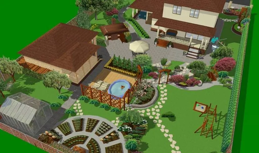Совсем другое дело, если вы бизнесмен и морковь собственного производства вас не интересует. Тогда огород переименовываем в зону для отдыха и барбекю. Разбиваем детскую площадку, а в дальнем интимном уголке участка за зелёными насаждениями возле пруда ставим баню.