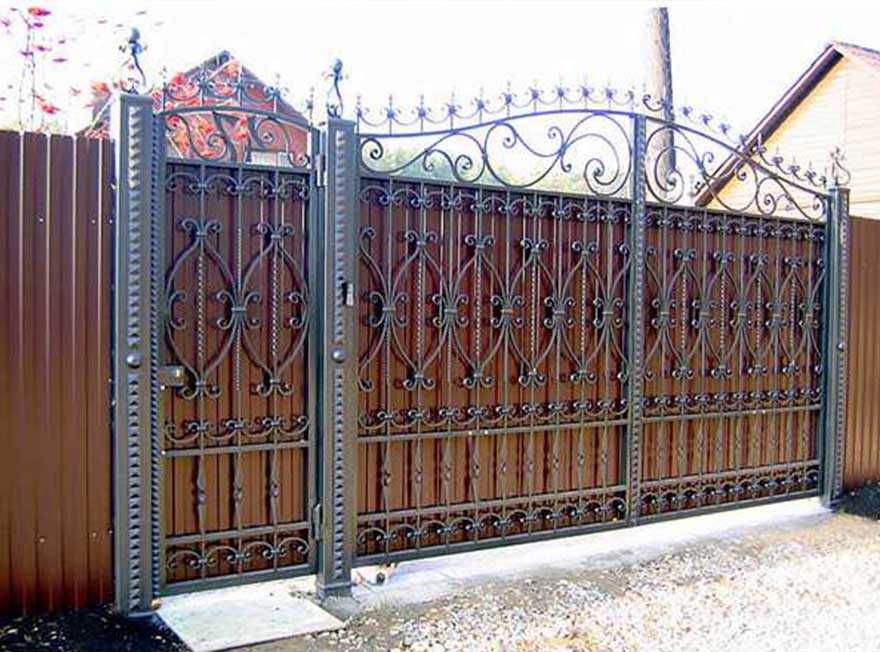 В распашных воротах и калитках прутья могут спускаться с вершины узора вниз, закрывая место расположения замков. Они не позволяют отогнуть край профлиста и добраться до запоров.