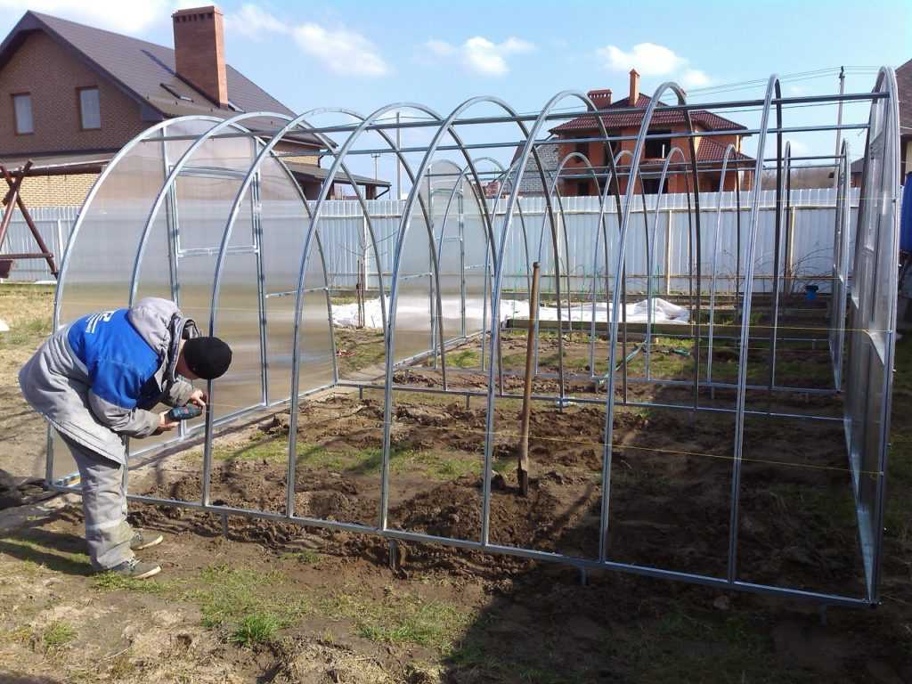 Сооружение каркаса. Сначала собираются две направляющие с «принимающими», затем — торцы и дуги. Стыки соединяются по принципу папа-мама, дуги и торцы — с использованием отрезков профильных труб. Конструкция типа «труба в трубе» обеспечивает изделию дополнительную жесткость. Торцы и дуги устанавливаются на принимающие и фиксируются с помощью саморезов. Стяжки фиксируются с помощью спайдерных пластин, место стыка торцов с верхней стяжкой — уголками. После сборки каркаса монтируется дверь и форточки.