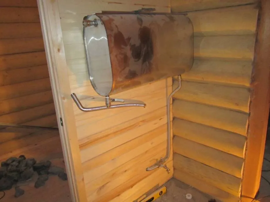 - Емкость устанавливается в парилке бани под потолками и подключается к змеевику при помощи труб.