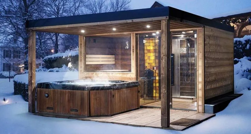 Сауна с джакузи — незабываемые впечатления зимним вечерком!Источник exterierovesauny.sk