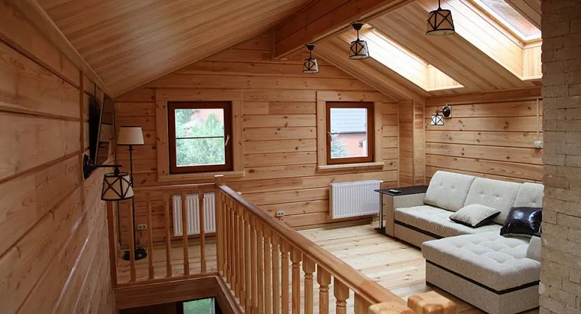 - потолок не выравнивают, наоборот, скаты подчеркивают массивными потолочными балками;