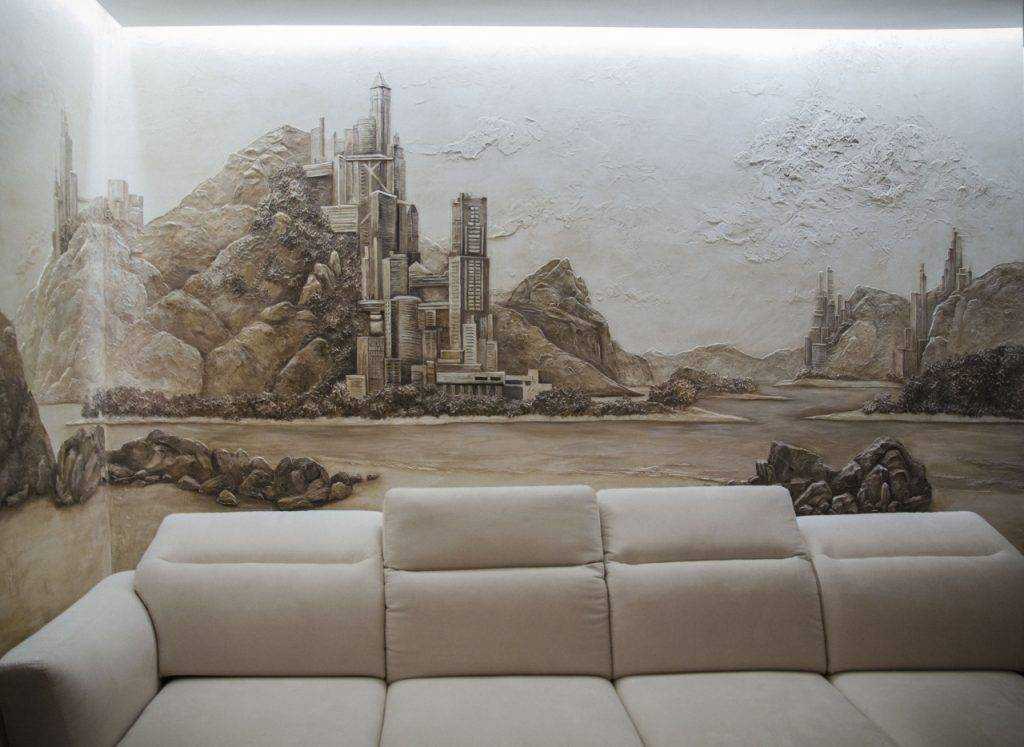 Барельефные узоры весьма разнообразны – тематика зависит исключительно от фантазии мастера. Барельефы делаются крупными, занимающими всю стену либо совсем небольшими, располагающимися над письменным столом, изголовьем кровати, межкомнатной дверью, аркой, по периметру окна, вокруг телеэкрана и др. Для различных комнат делаются разные картины.