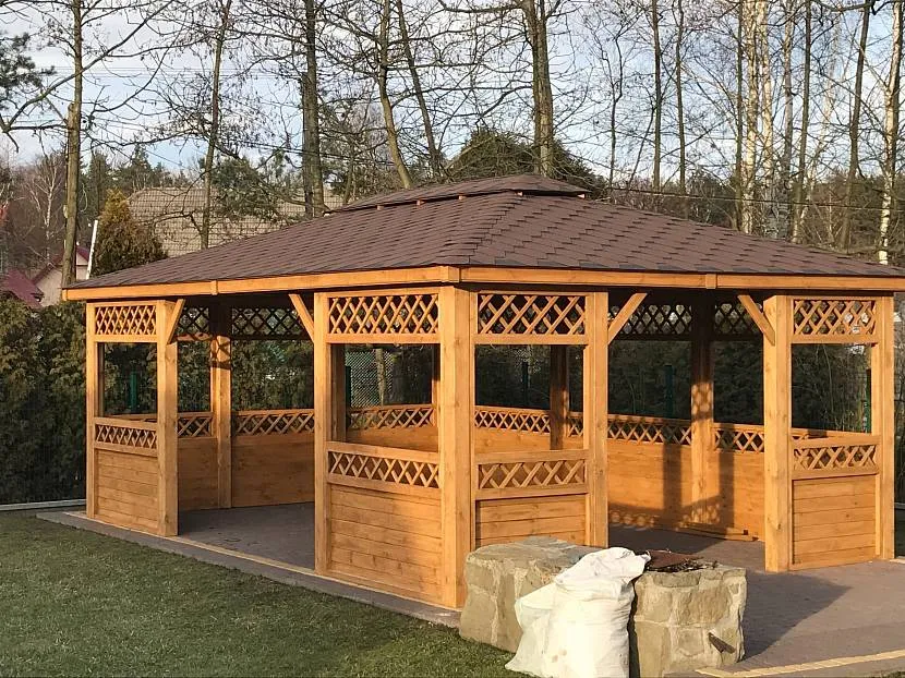 Шатровая крыша беседки из бруса, покрытая металлочерепицей, — красивый и богато оформленный вариант