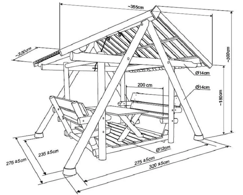 Этот вариант берут, когда беседку вообще негде расположить, но иметь ее очень хочется. В этом случае можно возвести лишь версию беседки. Поскольку она даже не имеет и подобия стен. А маленький стол с двумя лавками просто устанавливаются под небольшим навесом. Такую, чисто семейную модель, можно расположить на площадке всего в 4 квадратных метра. А детальнее все рассмотреть можно на приведенном чертеже. Там также даны и размеры беседки малютки, которые меняются по своему усмотрению.