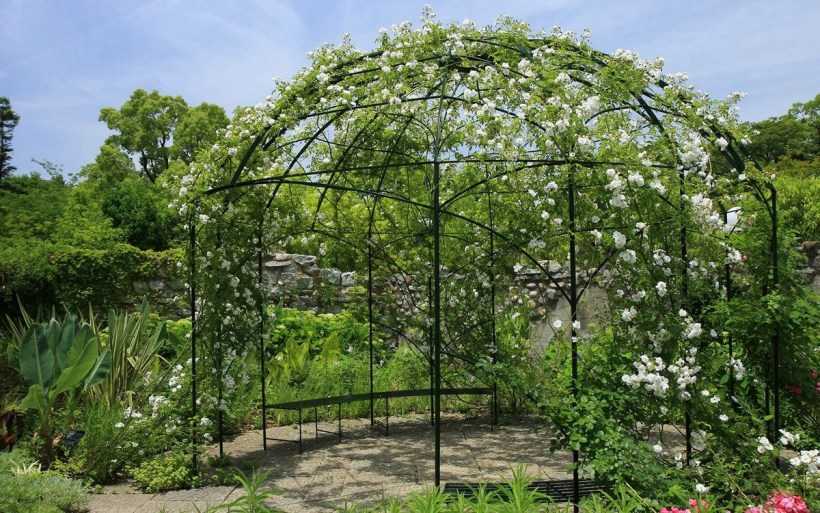 Очень интересно смотрится кованая круглая беседка на газоне, окруженная мощеной дорожкой или отсыпкой из гальки. Подходящим оформлением для нее являются яркие розы, на фоне которых хорошо выделяется темный металл.