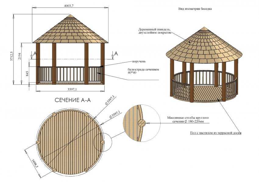 Что касается формы беседки, то постройка может быть овальной или округлой, квадратной или прямоугольной, шестигранной или многогранной. Определив размеры и тип конструкции, выбрав строительные и кровельные материалы можно переходить к созданию чертежа. Проект не только позволит избежать ошибок во время строительства, но и позволит грамотно рассчитать количество стройматериалов. Для выбора оптимального варианта предлагаем посмотреть фото готовых проектов, что представлены в нашем материале.