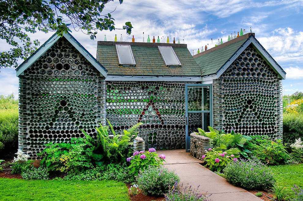 Имеется пример, когда стеклянные бутылки использовались как альтернатива кирпичу — также укладываются слоями на раствор, после чего стены шпаклюются и ровняются.