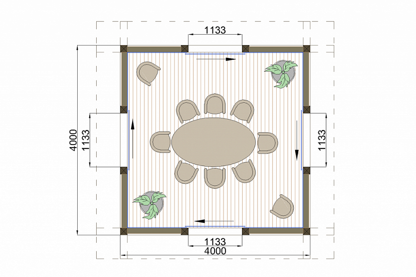 Беседка полузакрытого типа. Предназначена для выполнения функции столовой в теплую погоду. Конструкция защищена с углов от ветра и дождя. В ее проекте предусмотрены широкие проемы со всех 4 сторон