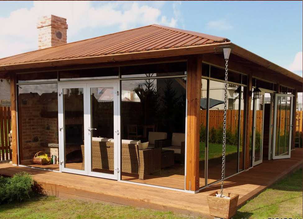 Практичность и востребованность небольших построек с остеклением обеспечивается возможностью их круглогодичной эксплуатации. Благодаря специально предусмотренным распашным, откидным или раздвижным оконным конструкциям, обеспечить оптимальную температуру на площадке не составит никакого труда. Вы можете отдыхать в помещении в любое время года и время суток. Если обустроить беседку комфортной мягкой мебелью – то можно её превратить в отличный гостевой домик на выходные. В летний период можно открыть все окна, чтобы обеспечить нужную температуру и лёгкий сквозняк.