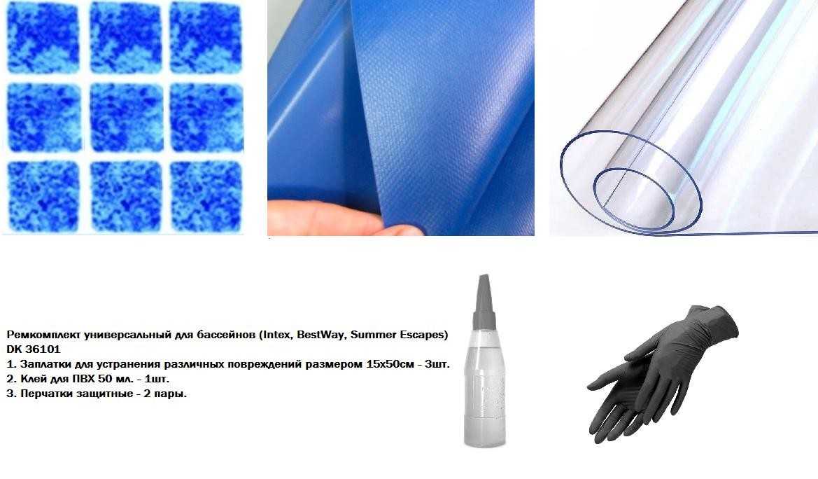 Такие производители из каталога Epool, как INTEX и Bestway, выпускают готовые ремкомплекты, в состав которых входит кусочек материала из ПВХ для выкраивания латки и водостойкий клей. В отдельных случаях набор дополняется жидкостью для обезжиривания. Благодаря тому, что материал для латки прозрачный, можно незаметно заклеить резервуар любого цвета. Восстановление бассейна начинают с обезжиривания рабочей поверхности. Затем наносят клей вокруг повреждения, на латку и тщательно прижимают её – для этой цели можно использовать пресс.