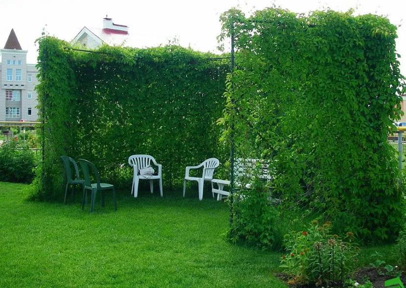 По периметру шалаша высаживаются вьющиеся многолетние растения. Конечно, можно посадить девичий виноград, но он уж слишком часто применяется для озеленения подобных мест, да, к тому же, дает много поросли. Лучше использовать кое-что экзотичнее, например, кампсис, актинидию, вечнозеленый плющ.