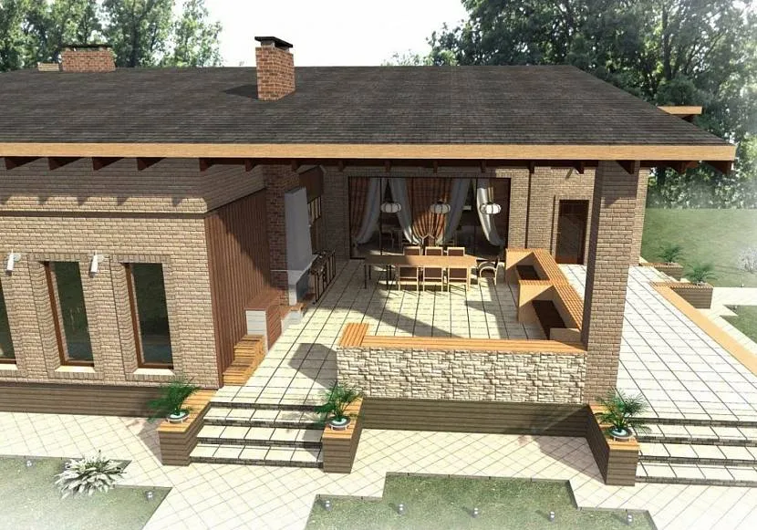 По своему устройству веранда является лишь пристройкой к бане (как к основному строению). Помимо объединённой с баней крышей, зона барбекю служит защитой от ветров, так как у неё одна общая стена с постройкой и по периметру небольшие перегородки.