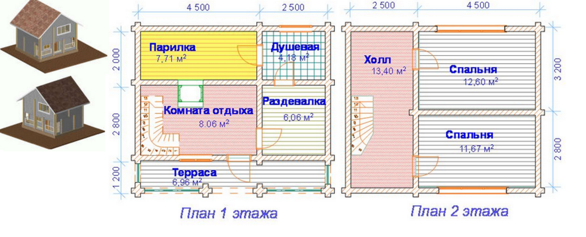 Наиболее распространенные стандартные решения, классика с хорошей функциональностью и экономичным бюджетом. Составляя чертежи одноэтажной бани, учитывайте следующие моменты: