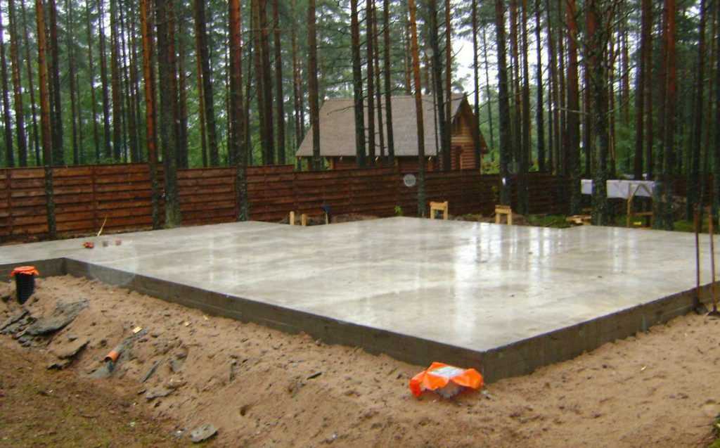 При выполнении работ своими руками проще соорудить основание в виде плиты. Это – самый доступный вариант строительства, в котором все работы несложно выполнить самостоятельно. Снять грунт, уложить армирующую обвязку, залить бетонный раствор.