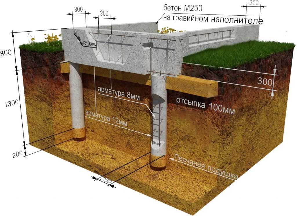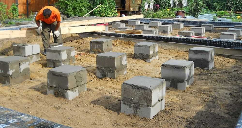 Обычно столбчатый фундамент из блоков делают незаглубленным или малозаглубленным. Подобный тип фундамента лучше не применять на подвижных почвах или при повышенном уровне подземных вод.