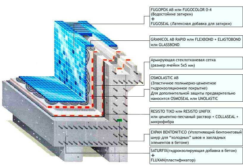 В поперечном разрезе стенка чаши бассейна представляет довольно сложный «пирог», в котором может быть несколько водоупорных слоёв. Их состав, тип и расположение определяются конструкционными особенностями стенок и дна, а также используемыми материалами для облицовки.