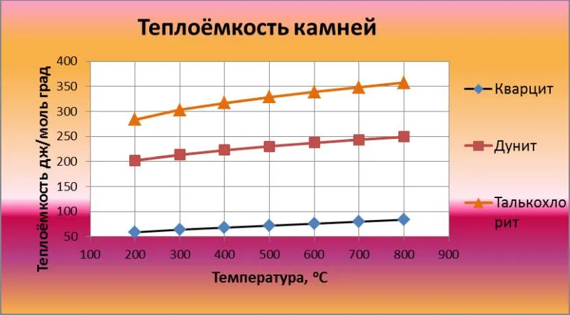 Теплоемкость – самая важная характеристика. Прежде чем купить, нужно разобраться, какие камни лучше для бани в парилке по теплоемкости. Ведь именно от этого зависит скорость нагрева и время удержания тепла внутри породы. Под это свойство идеально подойдут однородные образцы с высокой плотностью:
