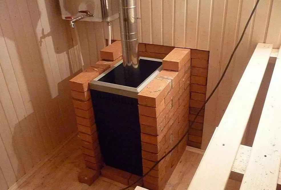 Для обогрева парилки и предбанника обустраивают печи «по-белому». Кирпичная конструкция оснащена дымоходом. Камни отделены от топки глухой плитой, предотвращающей проникновения чада внутрь бани. Топку располагают в предбаннике, а саму печь с каменкой – внутри парилки. Преимущество кирпичной конструкции в экологической чистоте. Недостатком является долгий процесс разогрева камней, который может затянуться до 12 часов.