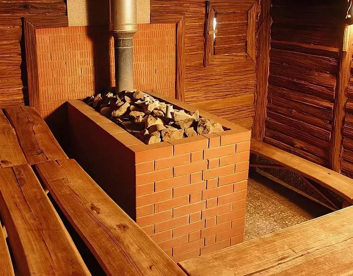 - Так как не будет необходимости открывать и закрывать дверцу топки со стороны парной, печь можно оградить барьером безопасности (кирпичным экраном), который исключит риск получения ожоговых травм во время принятия водных процедур.