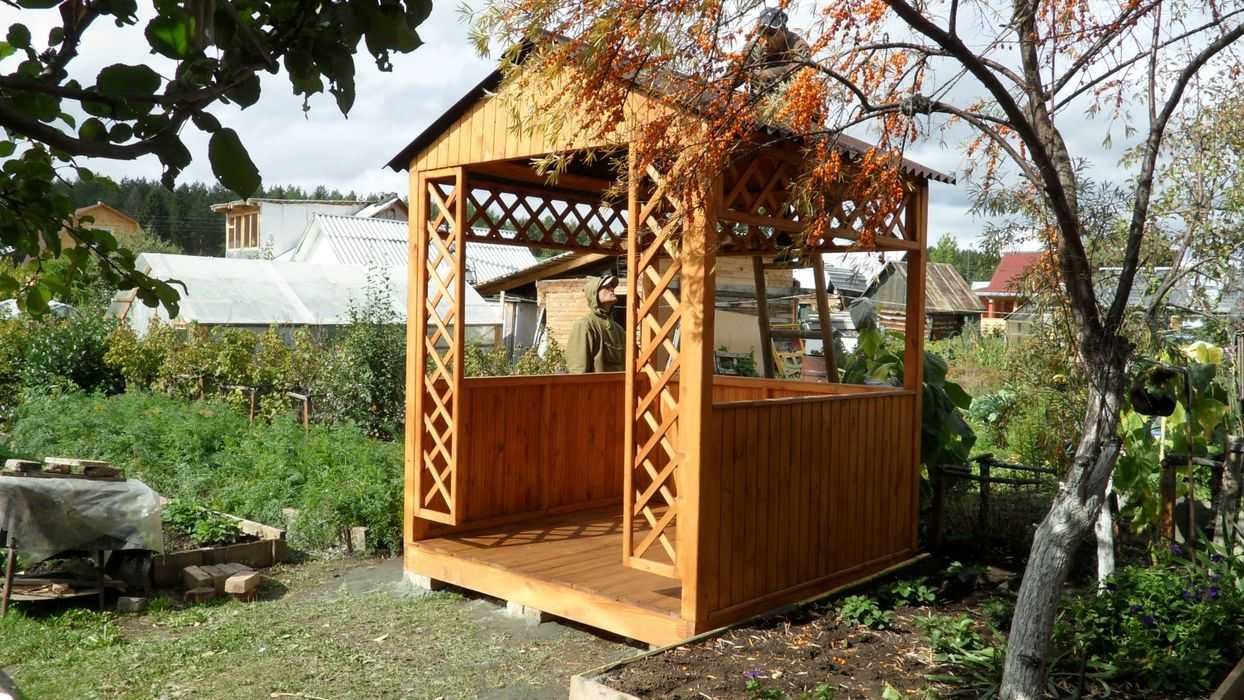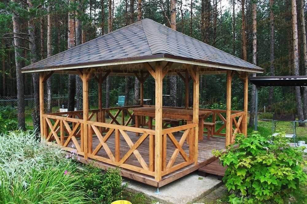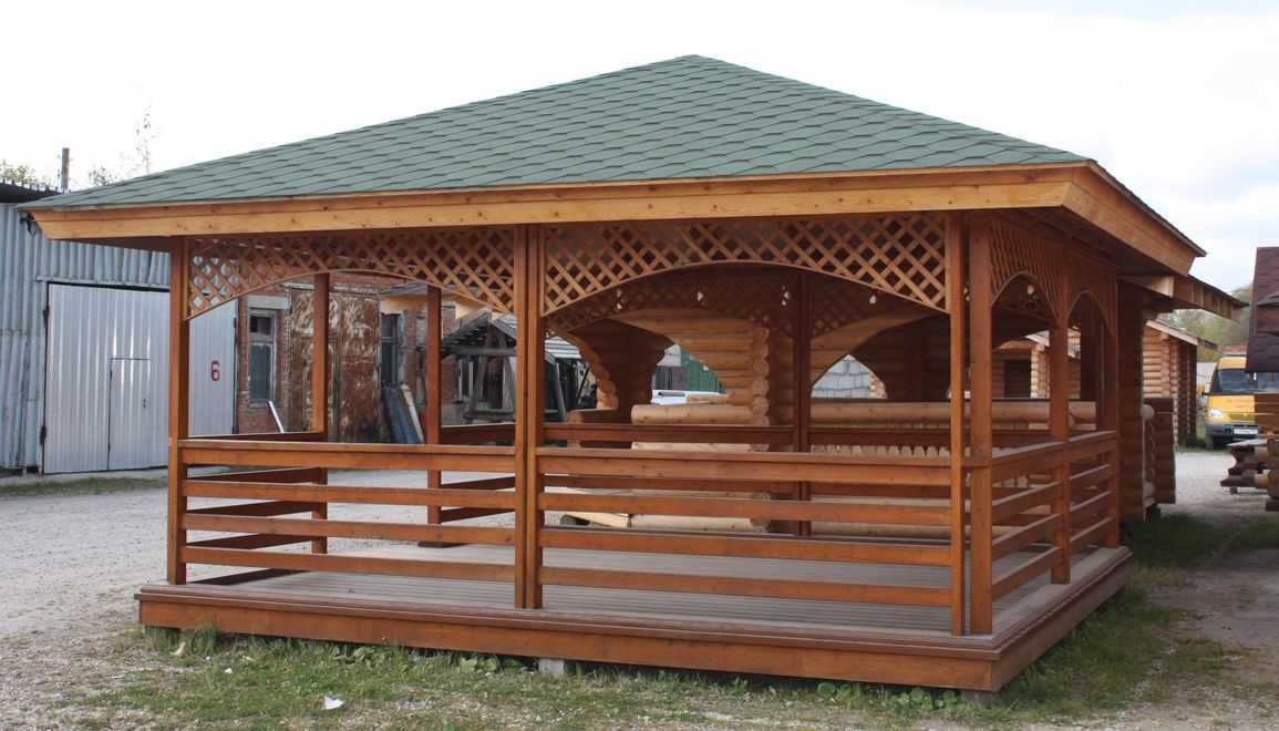 Классический строительный материал — дерево, является наиболее популярным и дешевым среди всех видов и форм беседок (если мы только не говорим об окоренных бревнах с диаметров 300 мм).