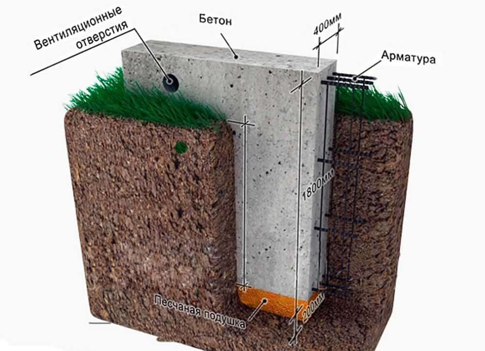 Ширина траншеи выбирается с расчетом присутствия боковой засыпки из того же материала, что и подушка — песка или ПГС. Задачами этих слоев является дренирование траншеи, предотвращающее контакт влаги и бетона.