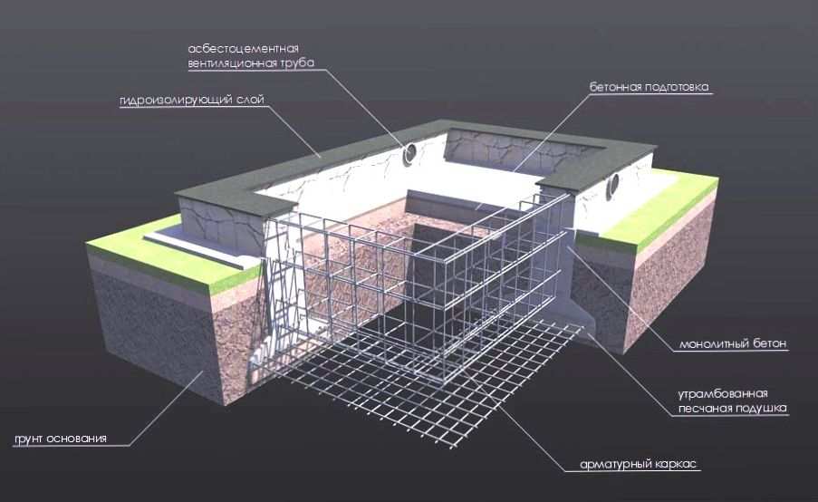 Для бетонирования плиты применяется бетон марки М300 и М400. Требования к бетону: коэфф. гидрофобности — W8, морозоустойчивость — 200 циклов, индекс подвижности — П3. Устройство фундамента предполагает гидроизоляцию конструкции после заливки, которая выполняется с помощью битумно-обмазочных материалов.