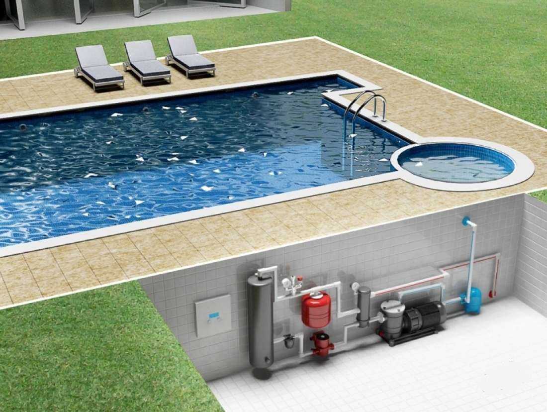 - Насосы, перекачивающие жидкость. Они необходимы для заполнения или опустошения чаши в случаях санитарной обработки, ремонта или ее консервации на зиму.