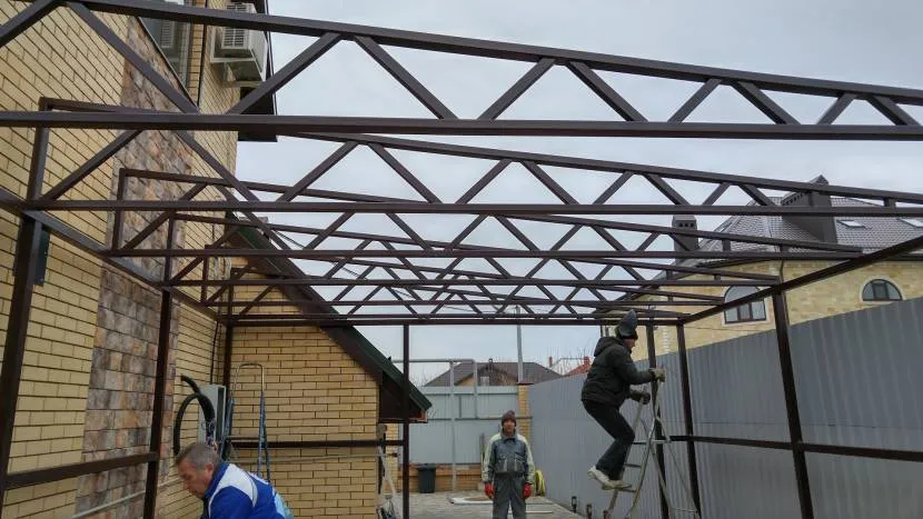 Расстояние между трубами не может быть более 1, 7 м, потому это нужно учитывать при планировании шага фермы. Чем больше перекрываемая сторона, тем больше стоек и, соответственно, дороже выходит навес, тем выйдет сложнее работа. Оптимально сделать пролет в три метра, он обеспечит достаточную площадь и при этом будет минимальным по затратам.