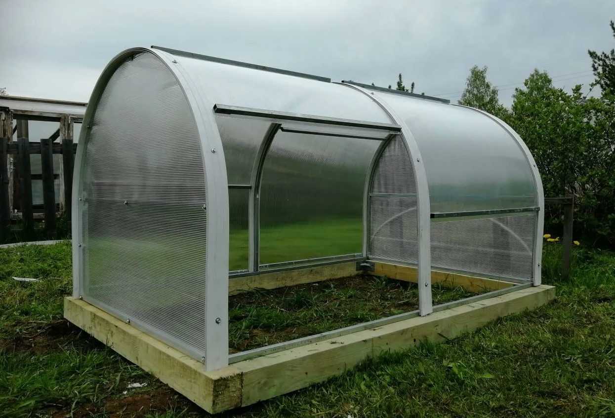 В солнечные дни пленку поднимают для проветривания растений. Возможно использование поликарбоната, который вставляется в цельный металлический каркас.