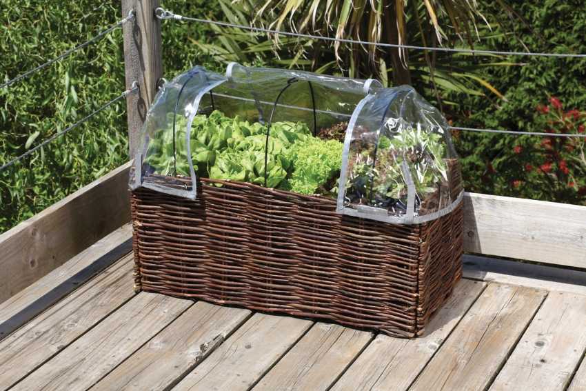 Стенки изготавливаются из стекла, полиэтиленовой пленки или поликарбоната, которые крепятся к раме. Данная мини-теплица после создания не поддается разборке, поэтому переставить ее в другое место будет проблематично.