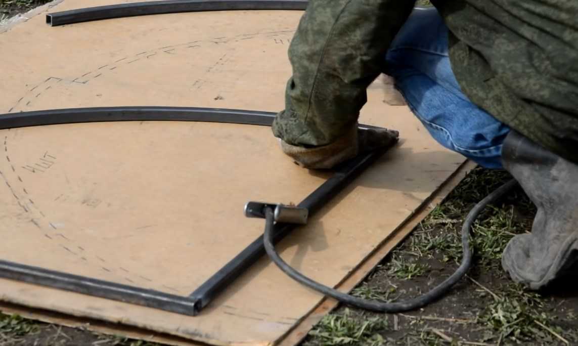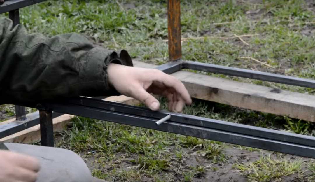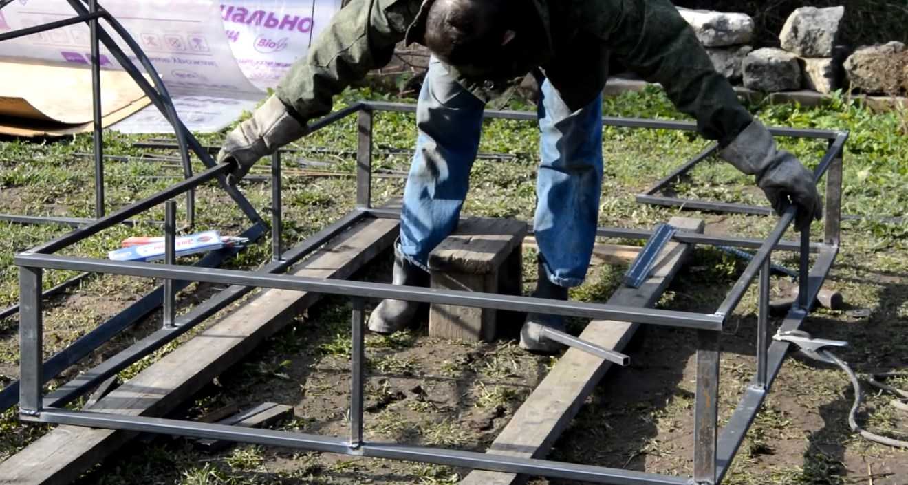 Отверстия для шарниров обязательно должны быть с наружной части. К отмеченной середине боковин нужно приварить заготовку, сделанную из труб 3,96 м. На этом каркасную часть можно считать готовой.