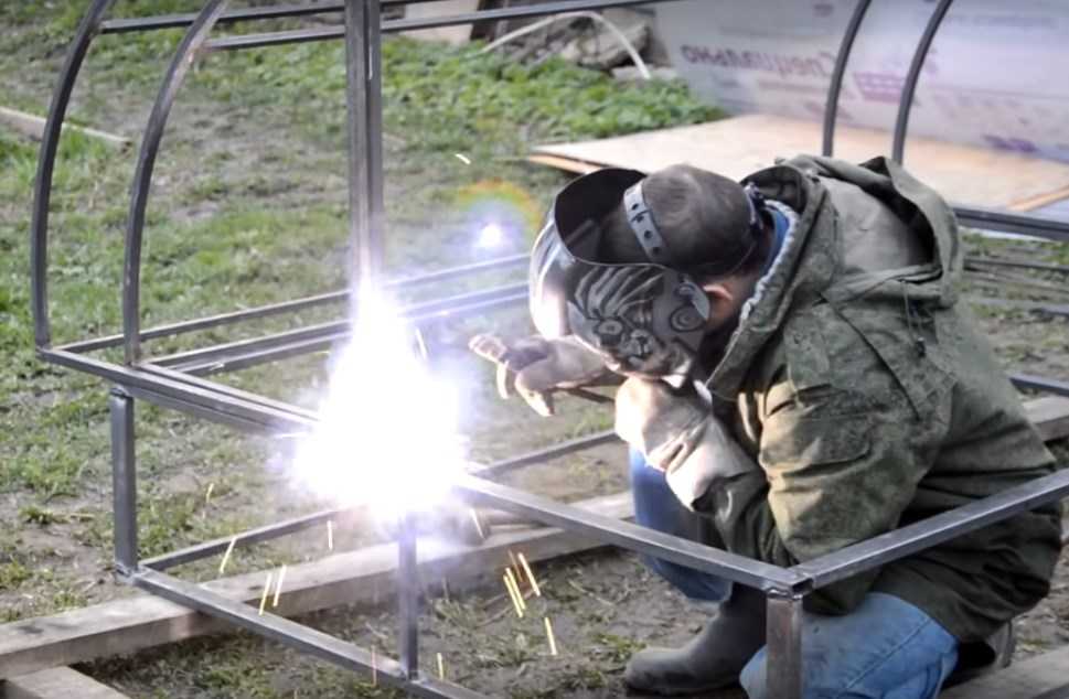 Для того чтобы сделать движущуюся часть конструкции, между собой сваривают боковые дуги и две поперечные планки длиной 4 м. Осевые планки, которые обеспечивают открывание при помощи шарниров также привариваются к каркасу. Каждую осевую планку нужно обрезать под углом 45º, после чего сварить их между собой. Углы при этом обязательно зачищаются.