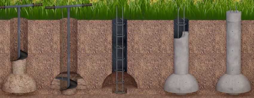 - Буронабивные столбы. Суть технологии сводится к предварительному бурению скважины определенных габаритов, а затем заливке ее бетонной массой. Сваи подобного вида укрепляются изнутри армирующим каркасом.