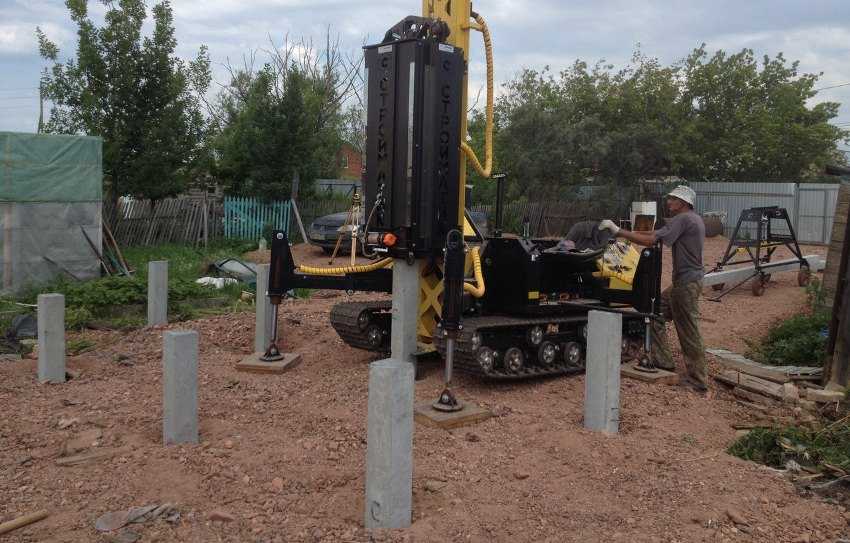 - Столбчатый фундамент. В этом случае применяются готовые ж/б-столбы. Они устанавливаются в предварительно рассверленные отверстия в почве.