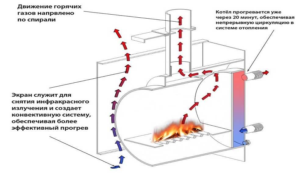 Путём размещения над топкой двух стальных листов канал прохода дыма удаётся значительно увеличить длину пути, который проходят перегоревшие газы, прежде чем выйти через дымоходное отверстие: