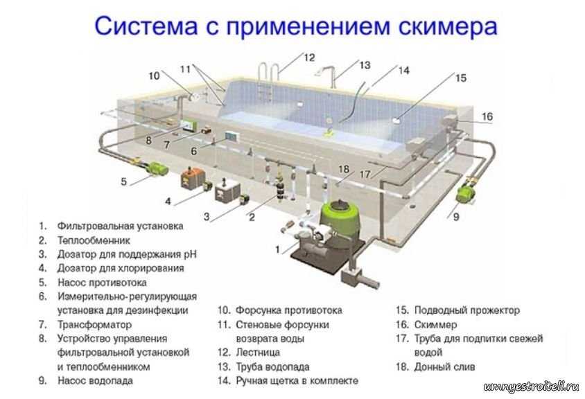 Ознакомившись со схемой, несложно разобраться с устройством переливного бассейна. Перечень коммуникаций следующий: