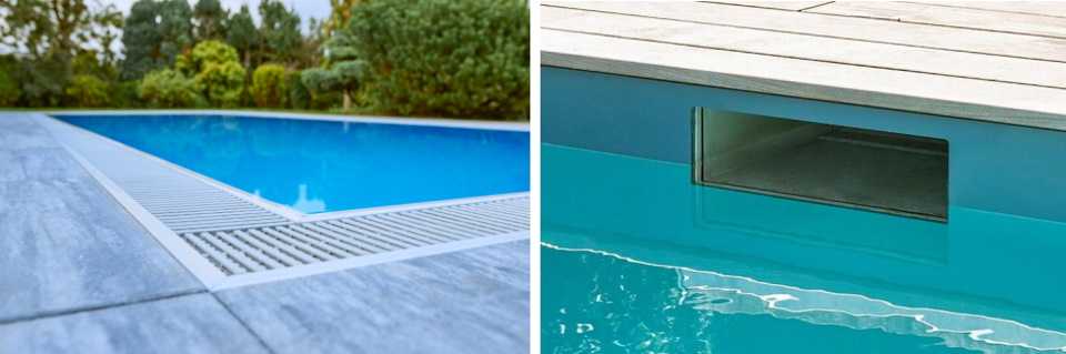 3. Бассейн может быть переливного или скиммерного типа. В первом случае вода через бортик переливается по желобу в систему фильтрации и переливной резервуар для последующего возвращения после очистки. В скиммерном варианте вода из ванны забирается через встроенные в стенки устройства.