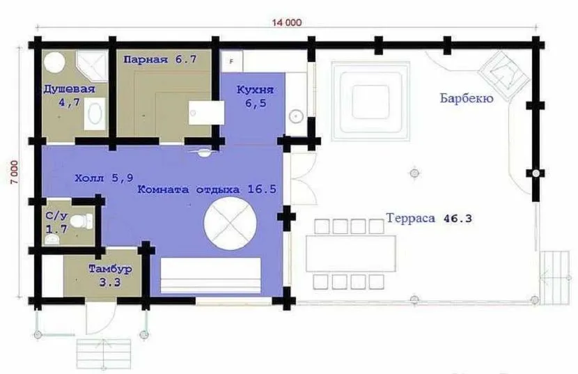 - какая планировка подойдёт. Если нет достаточно места, проект угловой бани с террасой и барбекю отлично подойдёт;