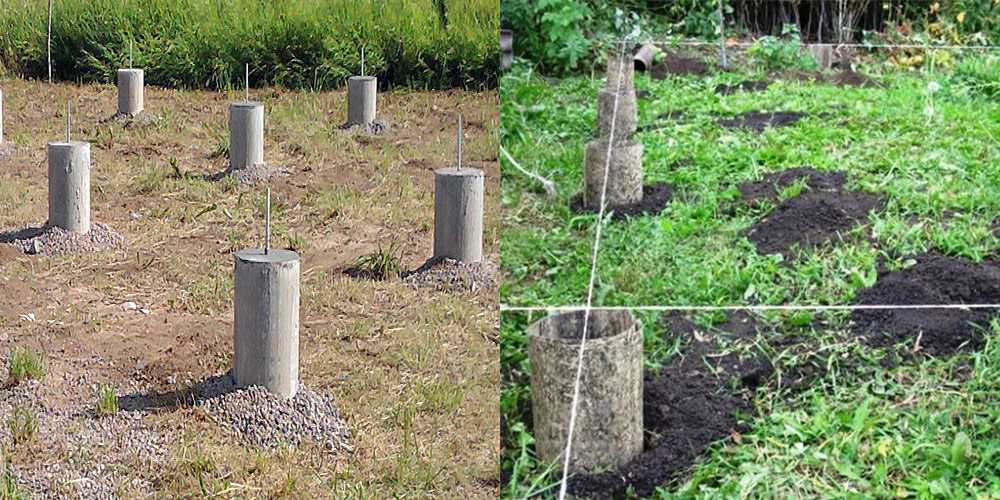 При строительстве небольших одноэтажных построек, а также некоторых элементов зданий, например, террас и веранд применяют столбчатый фундамент, который представляет собой отдельно стоящие опоры, оголовки которых (верхние торцы) выровнены в горизонтальной плоскости на определенной высоте от земли. Разметка данного типа оснований заключается в нанесении одной линии шнура на колышках по всему периметру строения. Дополнительно вдоль будущих стен с определенным шагом с помощью штыковой лопаты можно выкопать неглубокие ямки в местах монтажа опор.
